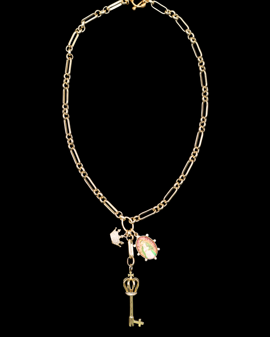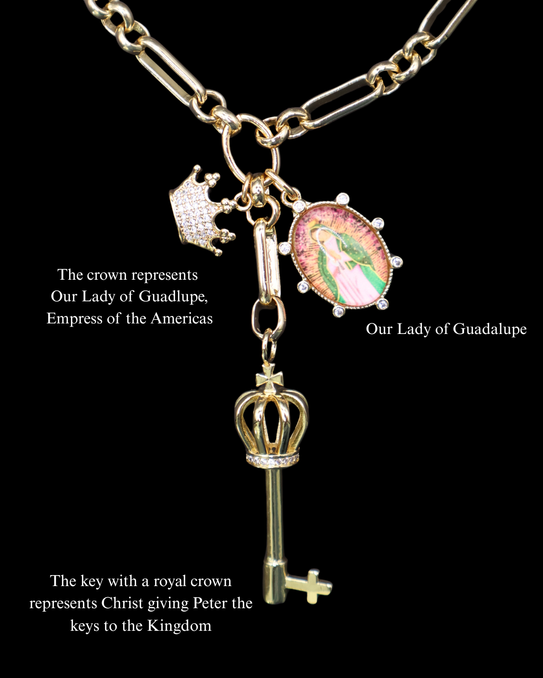 A stunning and unique necklace on an 18.5" chain featuring a royal cross key necklace, an Our Lady of Guadalupe picture charm, and a CZ pavé crown charm.