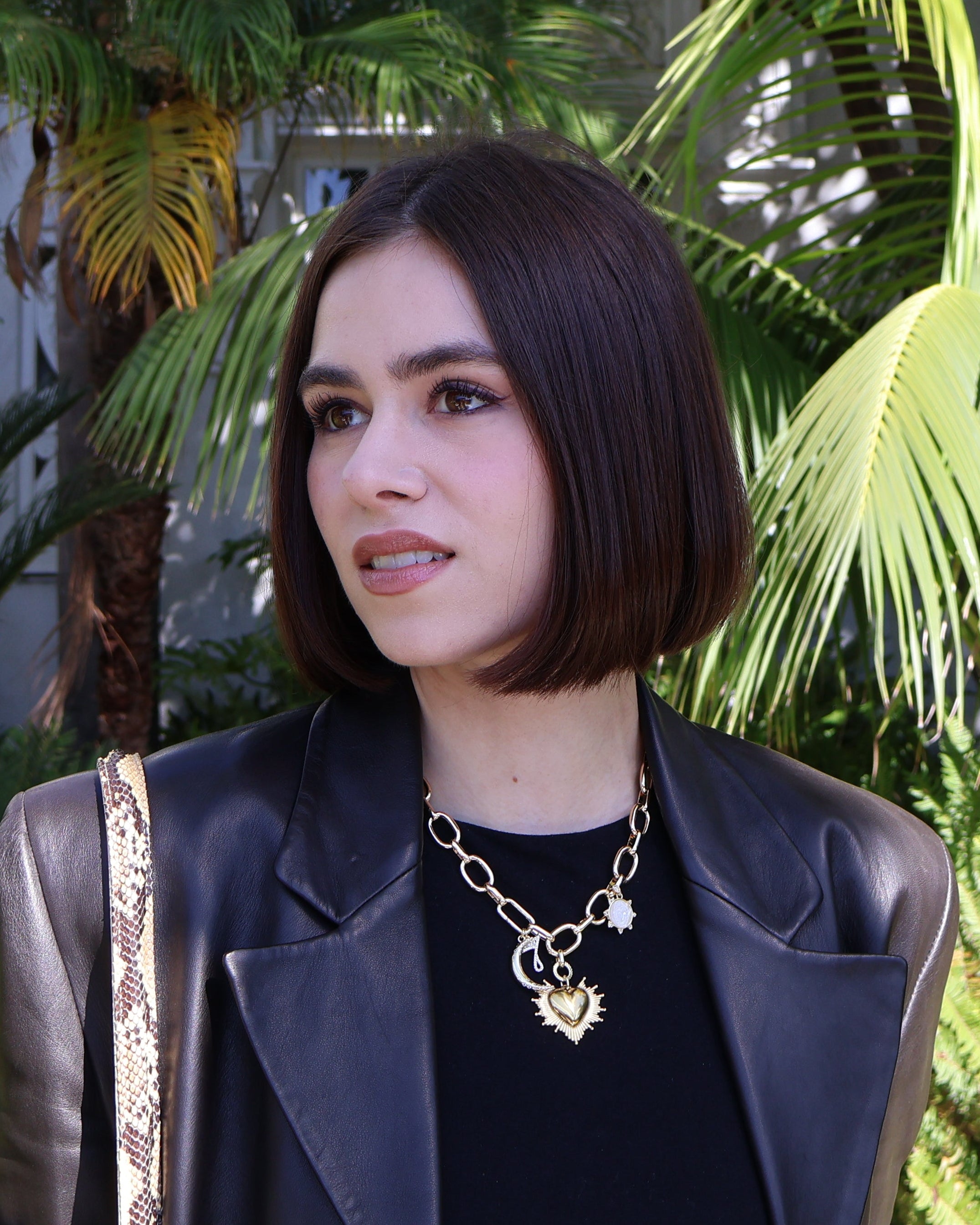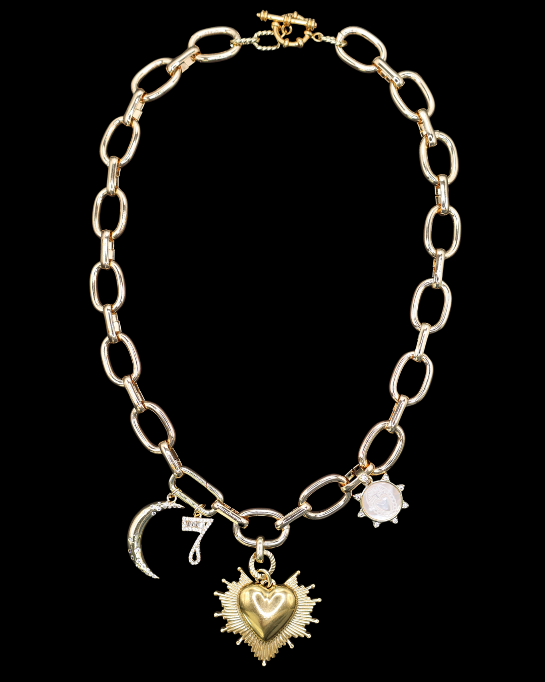 This stunning necklace features a 17" statement chain with a gold-plated heart with sun beams, a CZ-dotted crescent moon, a CZ pavé '7' charm, and a pearlescent sacred heart.