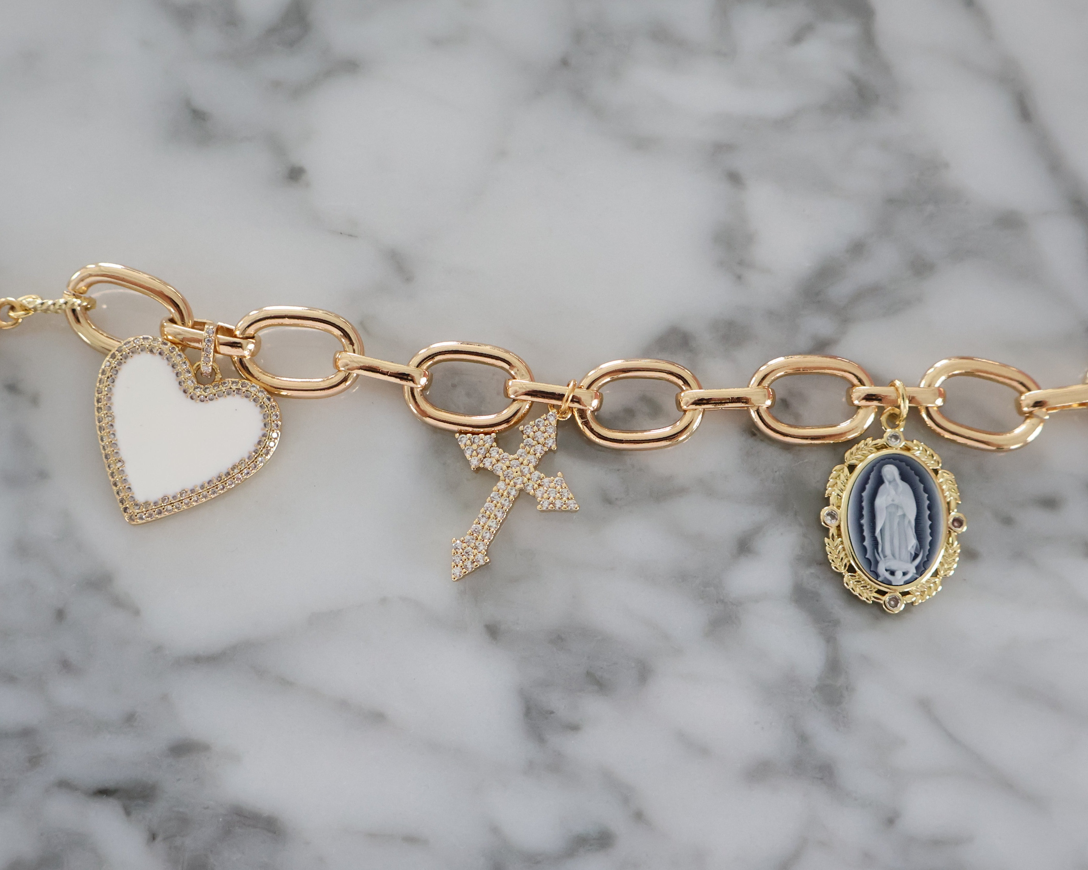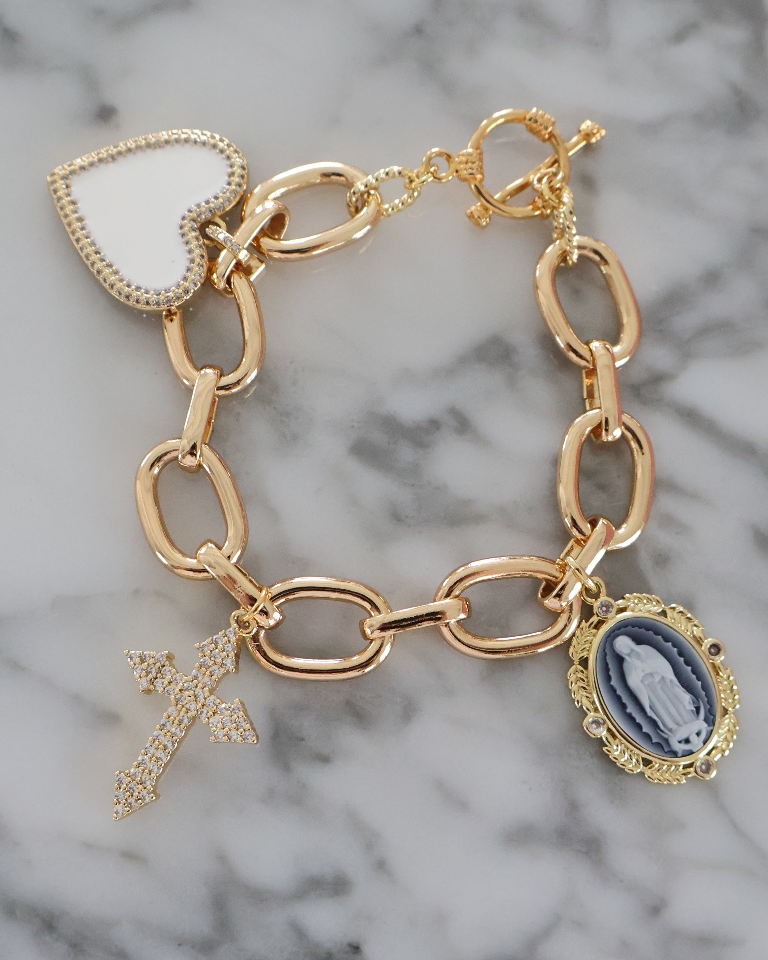Gorgeous gold-fill bracelet featuring an Our Lady Guadalupe cameo, pavé white heart, and pavé gothic cross charms. This bracelet is 8" and has a toggle clasp.